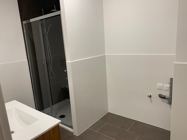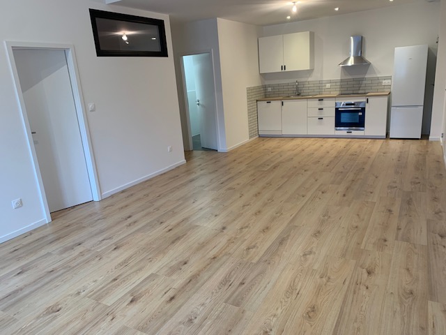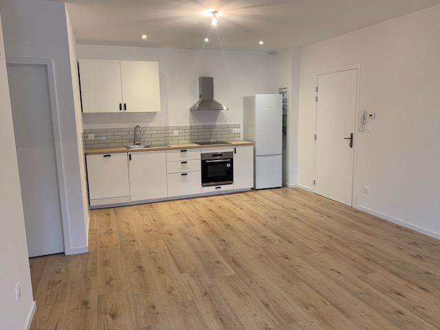 Une entrée, une cuisine équipée ouverte sur le salon salle à manger, deux chambres, une salle de douche avec un cabinet de toilette et un espace pour le lave-linge.