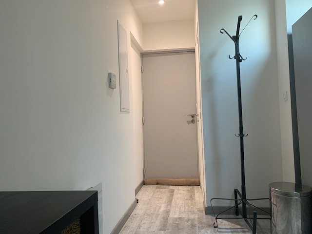 Une entrée dégagement, une cuisine équipée ouverte sur le salon, une chambre avec dressing, une salle de douche avec un cabinet de toilette.